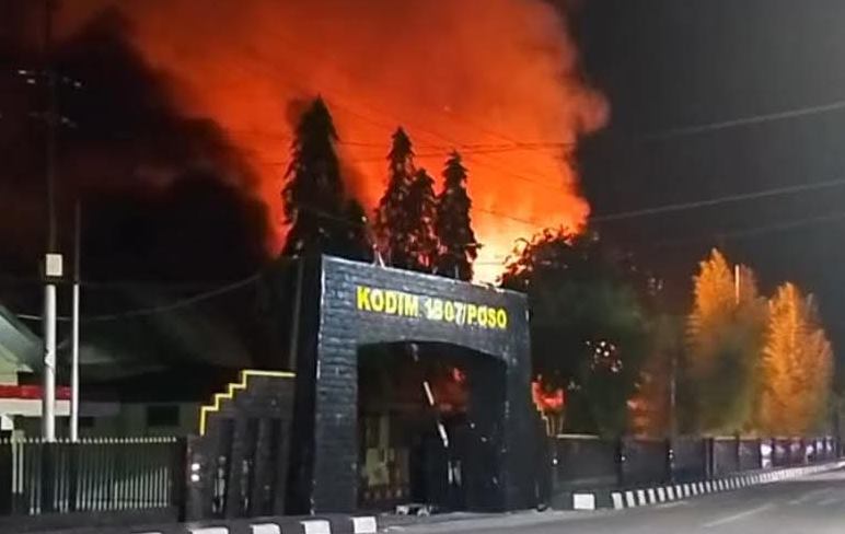 POSO, CS – Kebakaran hebat melanda Markas Komando Distrik Militer (Kodim) 1307/Poso di Jalan Urip Sumoharjo, Kelurahan Bonesompe, Kecamatan Poso Kota Utara, Senin (26/5/2025) malam.