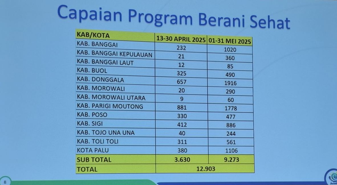 PALU, CS – Jumlah peserta program Berani Sehat yang diluncurkan Pemerintah Provinsi Sulawesi Tengah (Pemprov Sulteng) terus meningkat dan telah mencapai 12.903 orang.