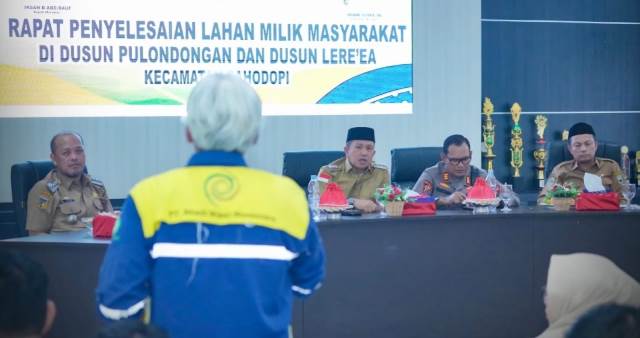 MOROWALI, CS – Bupati Morowali, Iksan Baharudin Abdul Rauf, memimpin rapat penyelesaian lahan masyarakat Dusun Pulondongan dan Dusun Lere’ea, Kecamatan Bahodopi dengan PT Abadi Nikel Nusantara.