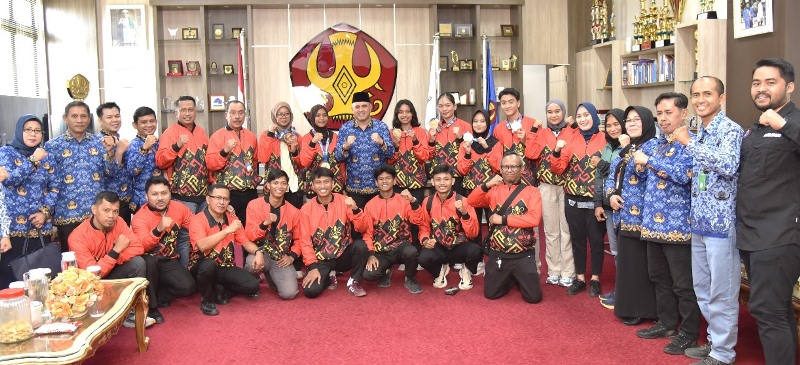 PALU, CS – Rektor Universitas Tadulako (Untad), Prof. Dr. Ir. Amar, S.T., M.T., IPU., ASEAN Eng., menyambut kedatangan atlet yang baru saja berlaga di Pekan Olahraga Mahasiswa Nasional (POMNAS) XIX Jawa Tengah 2025. Acara berlangsung di Ruang Rapat Rektor, Lantai 2 Rektorat Untad, Rabu (1/10/2025).
