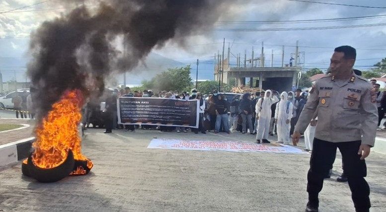 Massa aksi yang berjumlah ratusan orang itu membawa spanduk, pamflet, dan mobil pengeras suara. Tiga mahasiswa bahkan mengenakan Alat Pelindung Diri (APD) lengkap sambil membentangkan spanduk bertuliskan, “Pertambangan Emas Tanpa Izin di Sulteng Kejahatan yang Dilindungi, Dibiarkan atau Ketidakberdayaan Aparat Penegak Hukum”.