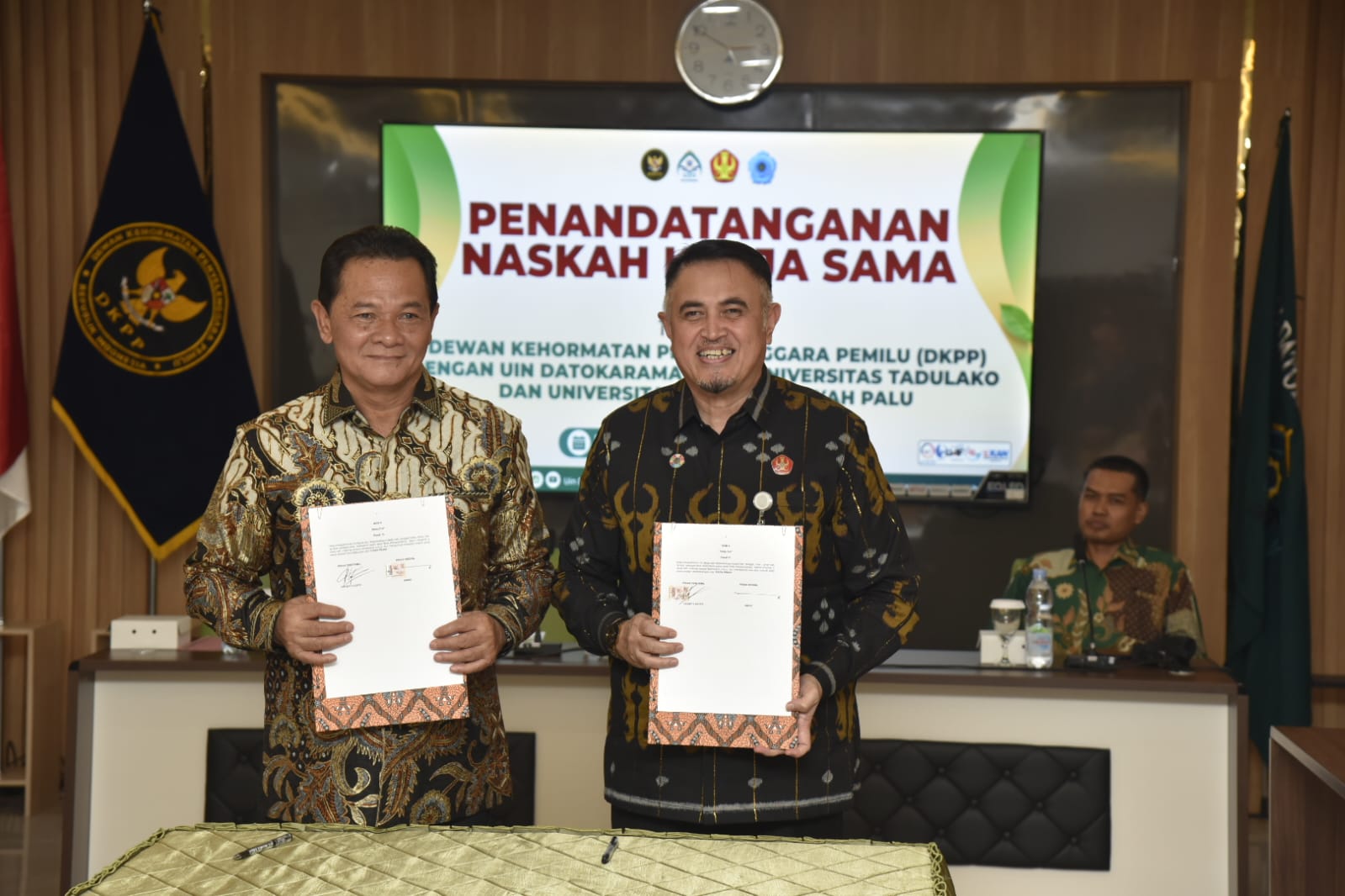 Penandatanganan dilakukan oleh Ketua DKPP, Heddy Lugito, bersama Rektor Untad, Prof. Amar, serta Dekan Fakultas Hukum Untad, Dr. Awaluddin, di Gedung Rektorat UIN Datokarama, Kamis (2/4/2026).